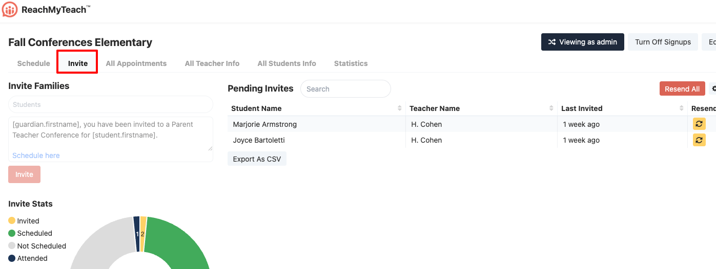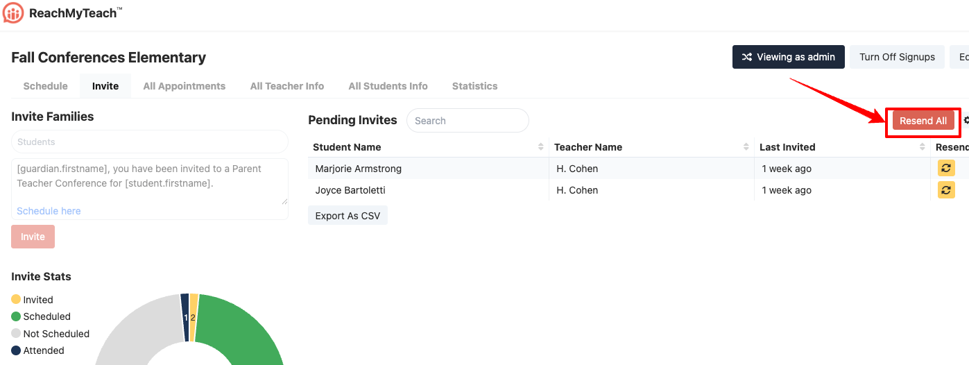 To boost family responses to your conference invitations, as an admin, it can be helpful to resend invites to those who haven’t yet signed up. We recommend doing this a day or two before your first conference.