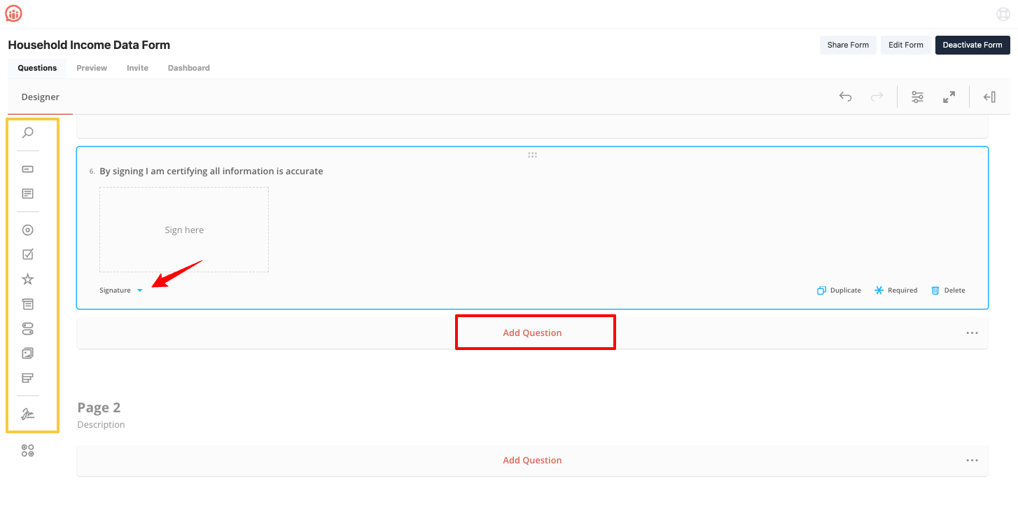 The form builder allows you to choose from a range of question types, such as multiple choice, short answer, dropdowns, and signature fields.
