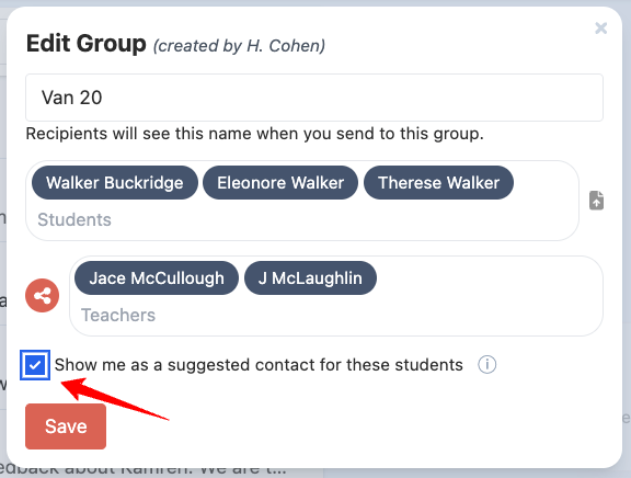 - When you’re creating or editing a group, you’ll see a checkbox labeled Show me as a suggested contact for these students: