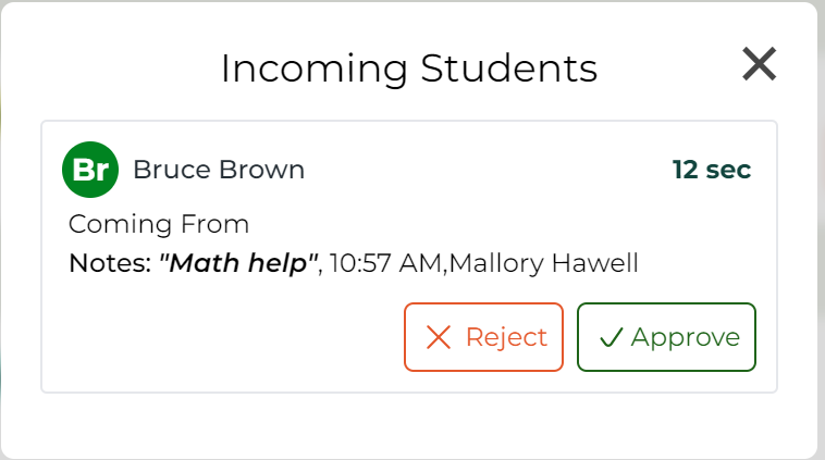 You can choose to approve or reject the pass. Approving it will move the pass to the Approved section, while rejecting it will notify the student of the decision. If you are unsure, press the X at the top of the pop-up to add the pass to the Pending section for later review.