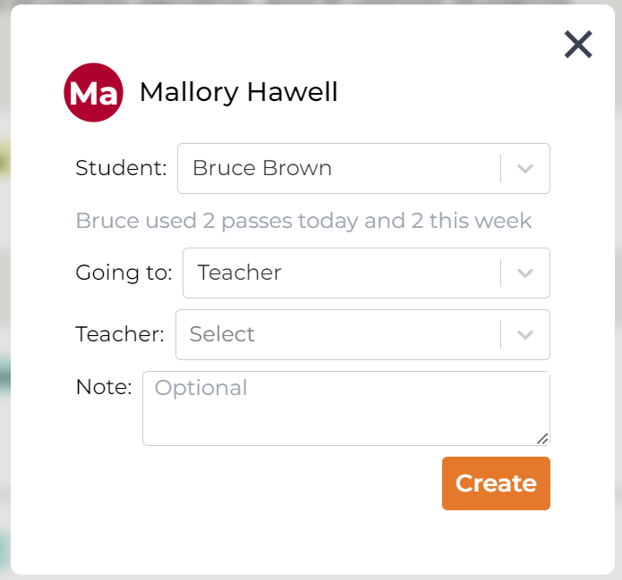 Depending on your school's settings, additional selection boxes and fields may appear. If you are sending a student to another teacher, select the teacher option. A new box will appear where you can choose the teacher.