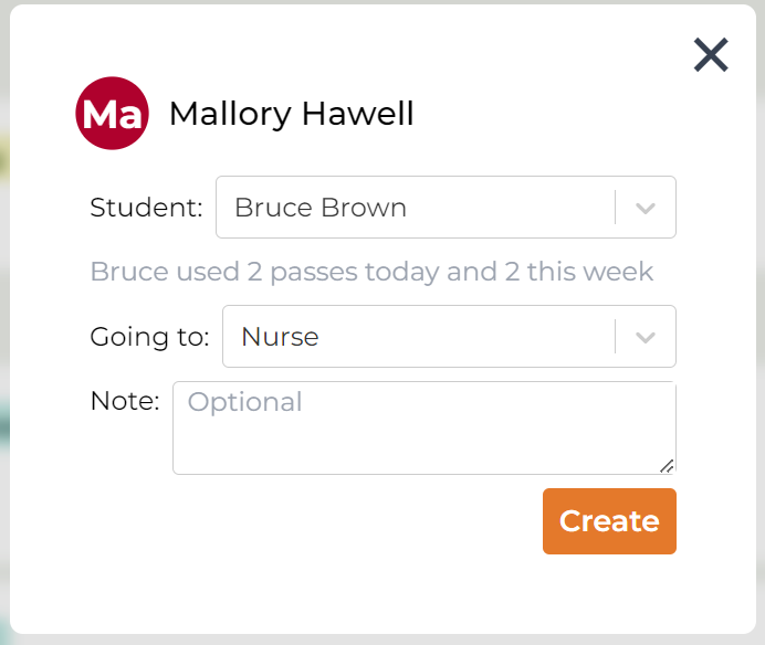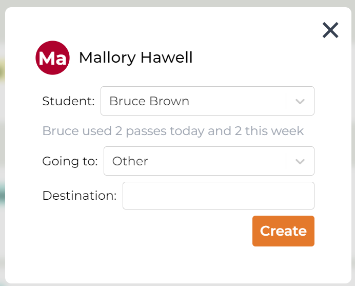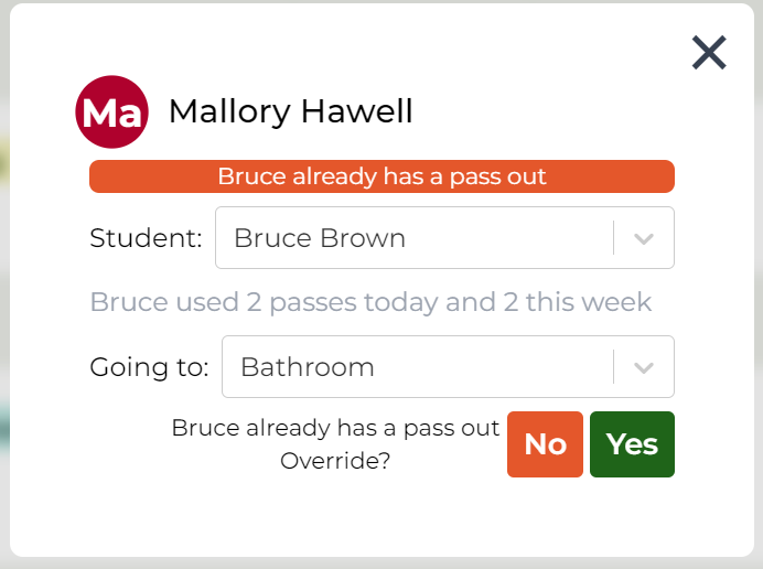 If the student already has an active pass or a bathroom buddy in the hall, you will be prompted to override the existing pass. Click Create, then Yes to confirm the override.