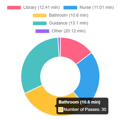 The pie chart allows administrators to see the locations of where students have been with in the selected time frame. Hovering over the section with its matching color coordinated label will show you how many passes are for that location and average time of the passes for that location.