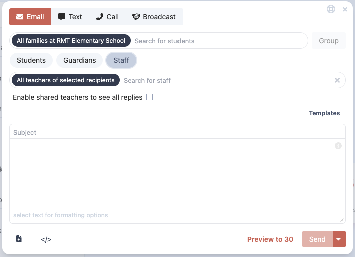 To share a message, start by crafting your message. First select who the message is regarding. Even for teacher only message a group of students or individual student must be selected.