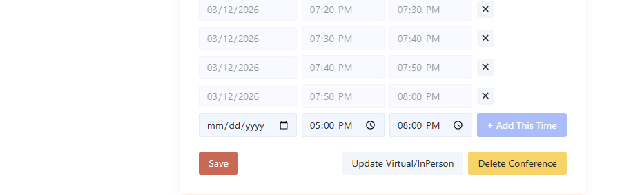 You need to create a conference first with all the days and times and SELECT Family Selct (both in person/virtual). Then